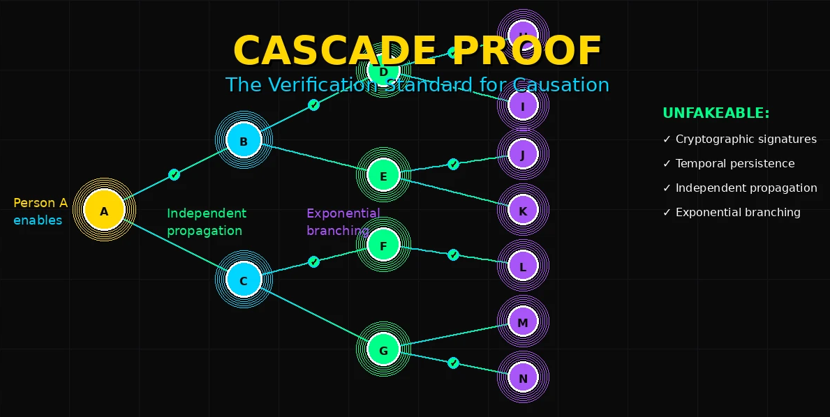 The solution: Cascade Proof is the first cryptographic standard that proves causation through the only pattern simulation cannot replicate—multi-generational capability cascades where Person A increases Person B’s capability, B independently enables C without A present, capability persists over time, and effects branch exponentially across human networks.